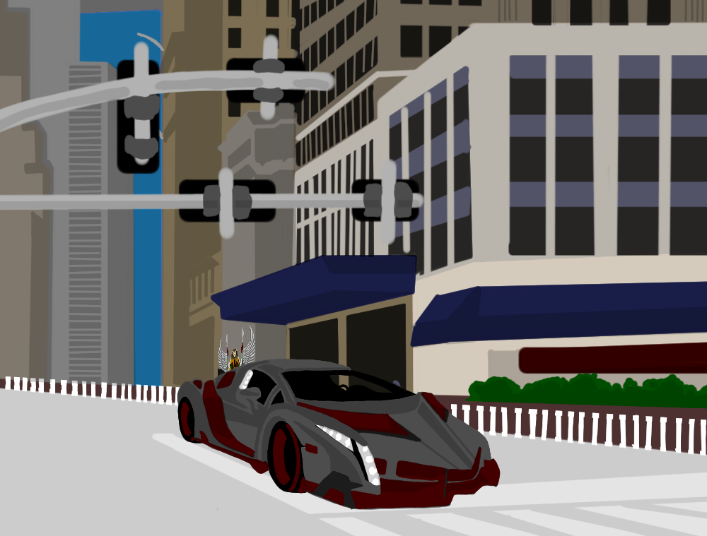 I think he’s sitting in a living room, wearing a fedora or something, I forget. The Burghal Thoroughfare Conveyance uses a Lamborghini Veneno, combined with a random photo reference of a city street I found on google image search.
